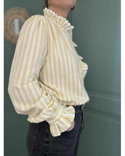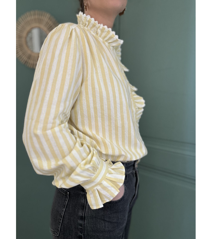 Chemisier Charlior rayures jaunes et blanches col froufrou