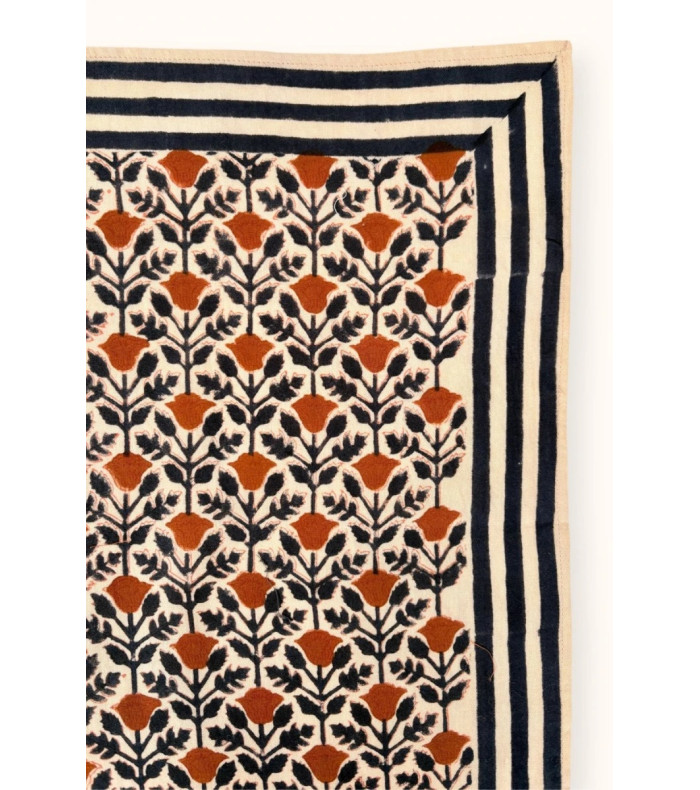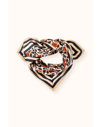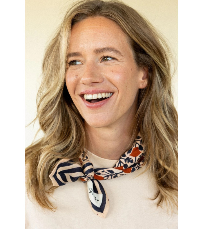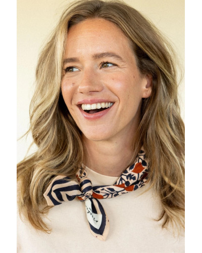 Confectionné en 100 % coton, il est léger, doux et agréable à porter. Son format compact (50 x 50 cm) permet de le nouer facilement autour du cou, dans les cheveux ou sur un sac pour une touche bohème chic.
